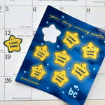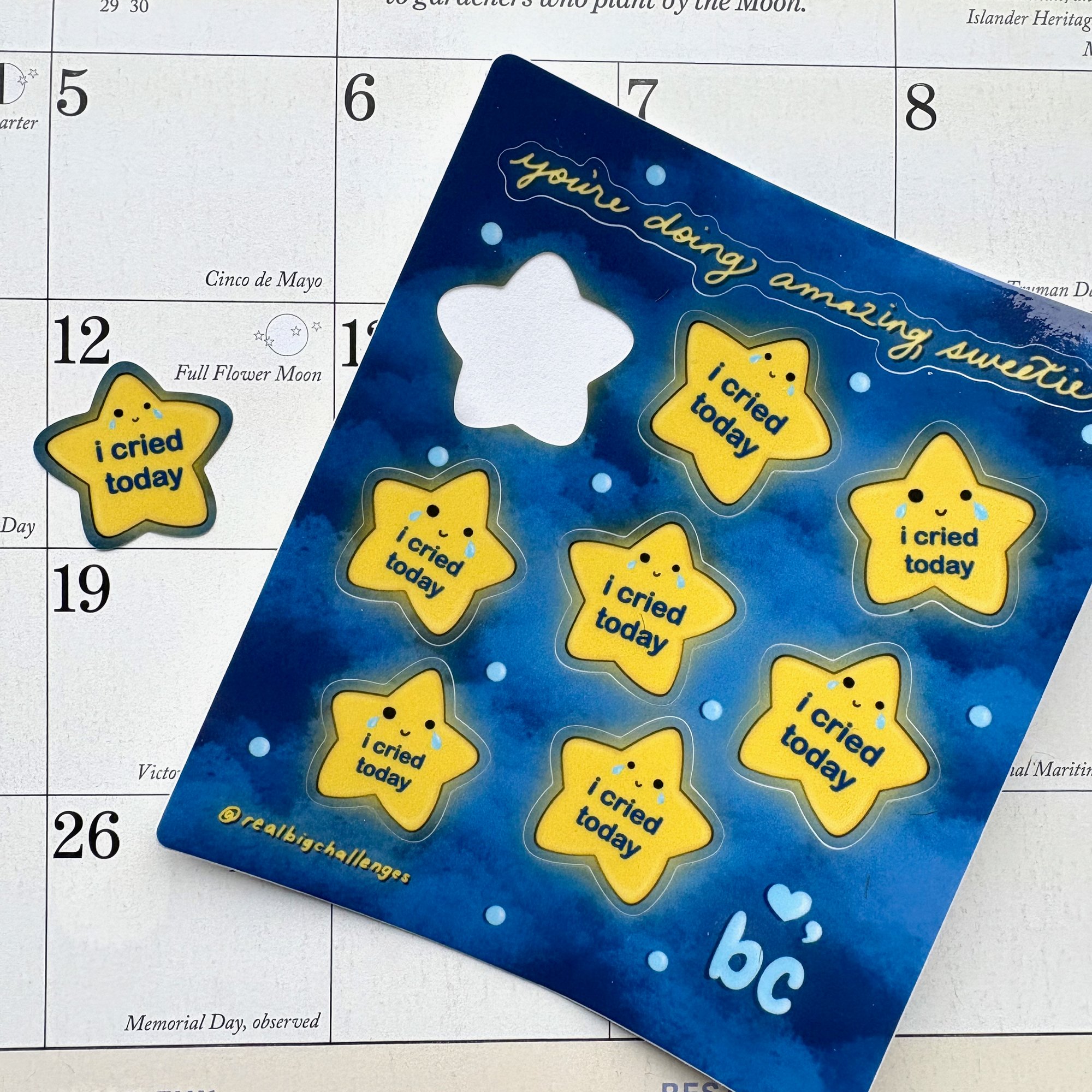 This adorable 3.75” x 4.75” waterproof vinyl sticker sheet features 8 “i cried today’ stars and a bonus message. Stars are 1”, perfect for planners or calendars.